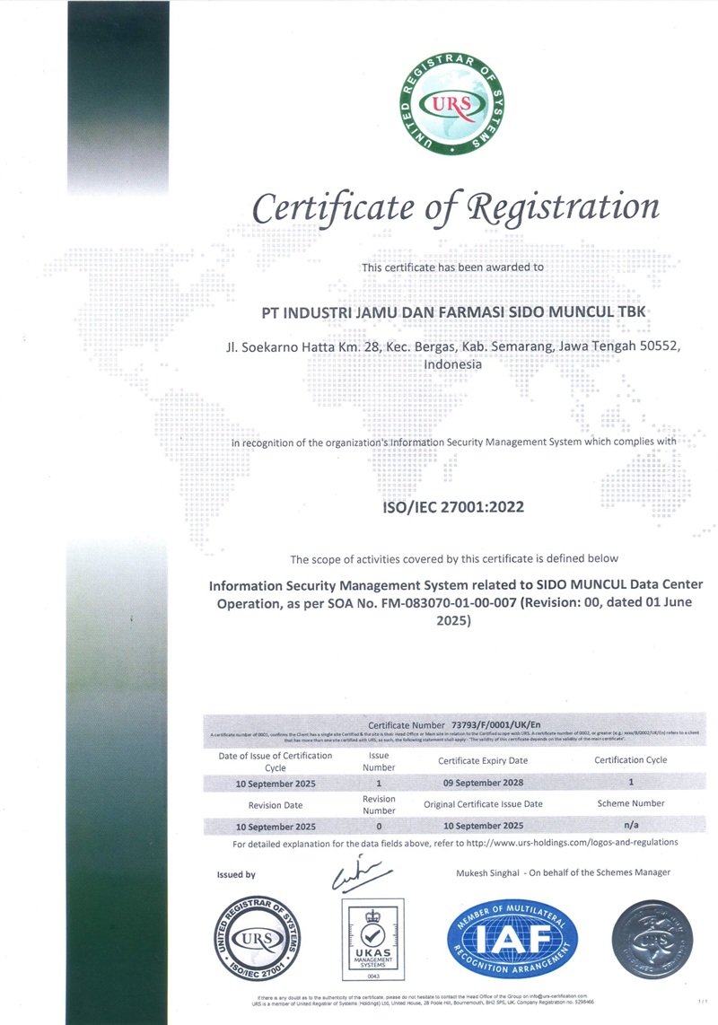 PT Industri Jamu Dan Farmasi Sido Muncul Tbk. was established in 1940 and is engaged in the manufacture of pharmaceuticals, traditional medicine, food, beverage, health, and cosmetic products. In our processes, we have adopted the following management standards: